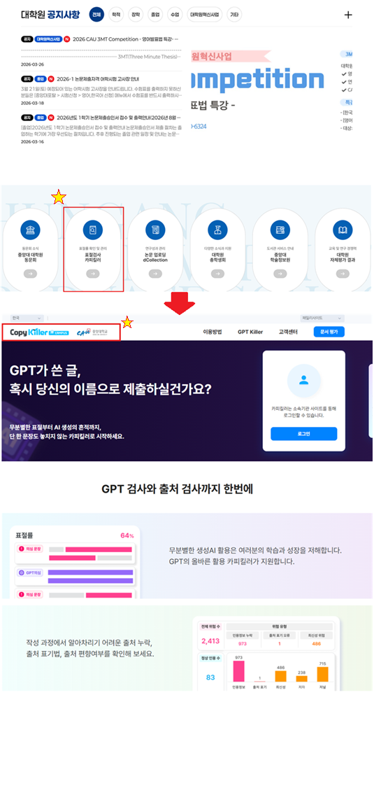 4. 카피킬러 캠퍼스 표절검사 진행 방법(첨부 5, 6 참고) 가. 반드시 일반대학원에서 계약하여 운영중인 카피킬러캠퍼스 사이트에서 진행해야 함 나. 대학원 홈페이지 (http://graduate.cau.ac.kr/)에서 하단 링크를 통해 접속 다. 반드시 대학원 홈페이지 링크를 통해 접속(포탈 로그인 필요) 라. 표절검사 기준값은 고정, (1) 기준 표절률 20% 이상 = 사유서 작성 (2) 기준 표절률 30% 이상 = 대학원 위원회 결정에 따라 졸업 연기될 수 있음 마. GPT킬러는 자율적 선택사항